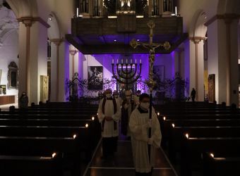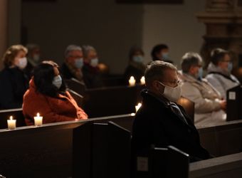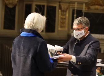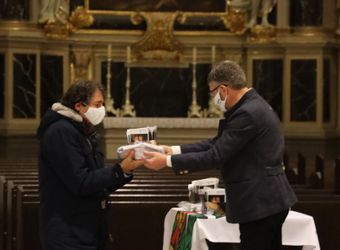 Vertreter der Orte, an denen am ersten Adventssonntag, 29. November, die dezentralen Eröffnungsgottesdienste der bundesweiten Eröffnung der Adveniat-Weihnachtsaktion 2020 stattfinden, erhielten am Ende des Aussendungsgottesdiensts Symbole.