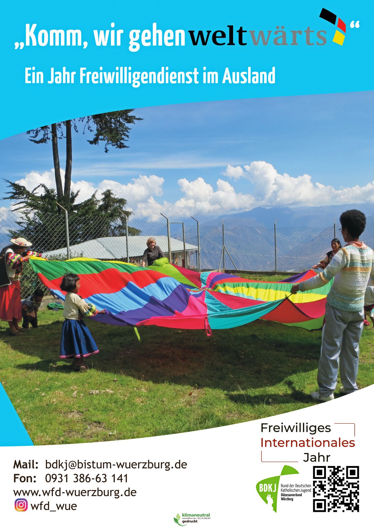 Der nächste Ausreisetermin ist für September 2021 geplant. Vorgestellt werden das Programm, die Kooperationspartner und die Einsatzstellen. Veranstalter ist der Bund der Deutschen Katholischen Jugend (BDKJ) Diözesanverband Würzburg. Der BDKJ ist zugleich die Entsendeorganisation, die sich um die Koordination, Vorbereitung, Durchführung und Nachbereitung des Einsatzes kümmert. Der Weltfreiwilligendienst richtet sich an junge Erwachsene im Alter zwischen 18 und 28 Jahren mit entwicklungspolitischem Interesse. Die Freiwilligen haben die Möglichkeit, zwölf Monate in einer Partnerorganisation in Afrika oder Lateinamerika in sozialen, ökologischen oder kulturellen Projekten mitzuarbeiten. Ziel sei es, die Perspektive zu wechseln, die Gesellschaft für entwicklungspolitische Fragen zu sensibilisieren und zur Völkerverständigung beizutragen, schreibt der BDKJ auf der Homepage. „weltwärts“ wird vom Bundesministerium für wirtschaftliche Zusammenarbeit und Entwicklung (BMZ) aus öffentlichen Mitteln gefördert. Die Veranstaltung ist kostenlos. Anmeldung bei Markus Bohlender-Saukel, Telefon 0931/38663141, E-Mail markus.bohlender-saukel@bistum-wuerzburg.de. Weitere Informationen im Internet oder auf Instagram (wfd_wue).
