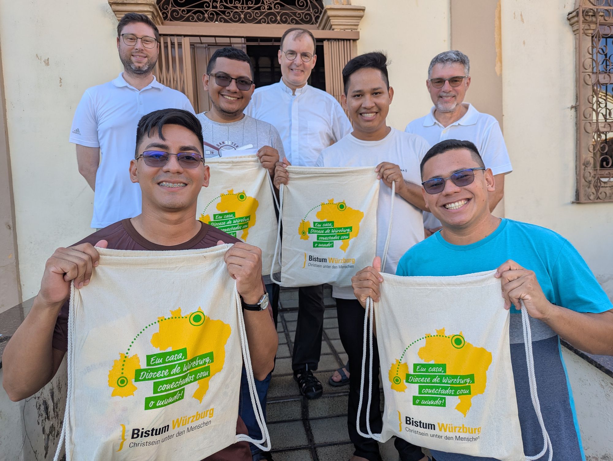 Für die Neupriester gab es auch Geschenke aus dem Partnerbistum. Zum einen erhielten sie jeweils ein Messgewand mit dem Logo des Heiligen Jahres. Weihbischof Reder sagt: „Das Schöne ist bei Euch, wenn man im Jubiläumsjahr Priesterweihe hat, hat man auch im Jubiläumsjahr Jubiläum der Priesterweihe.“ Außerdem gab es „Kilianstaler“, ein Gebäck, auf dem der heilige Kilian zu sehen ist, der Patron des Bistums Würzburg. Um nochmal genauer auf die Partnerschaft hinzuweisen, bekamen die Neupriester Beutel mit dem Aufdruck „Em casa, Diocese de Würzburg, conectados com o mundo!“ – „Im Bistum Würzburg zuhause, mit der Welt verbunden“. Außerdem ist dort als Karte die Verbindung der Bistümer Óbidos und Würzburg zu sehen. „Die Tasche steht dafür, dass noch viel reinpasst in die Partnerschaft. Eine Zukunftstasche“, erklärte Weihbischof Reder.
