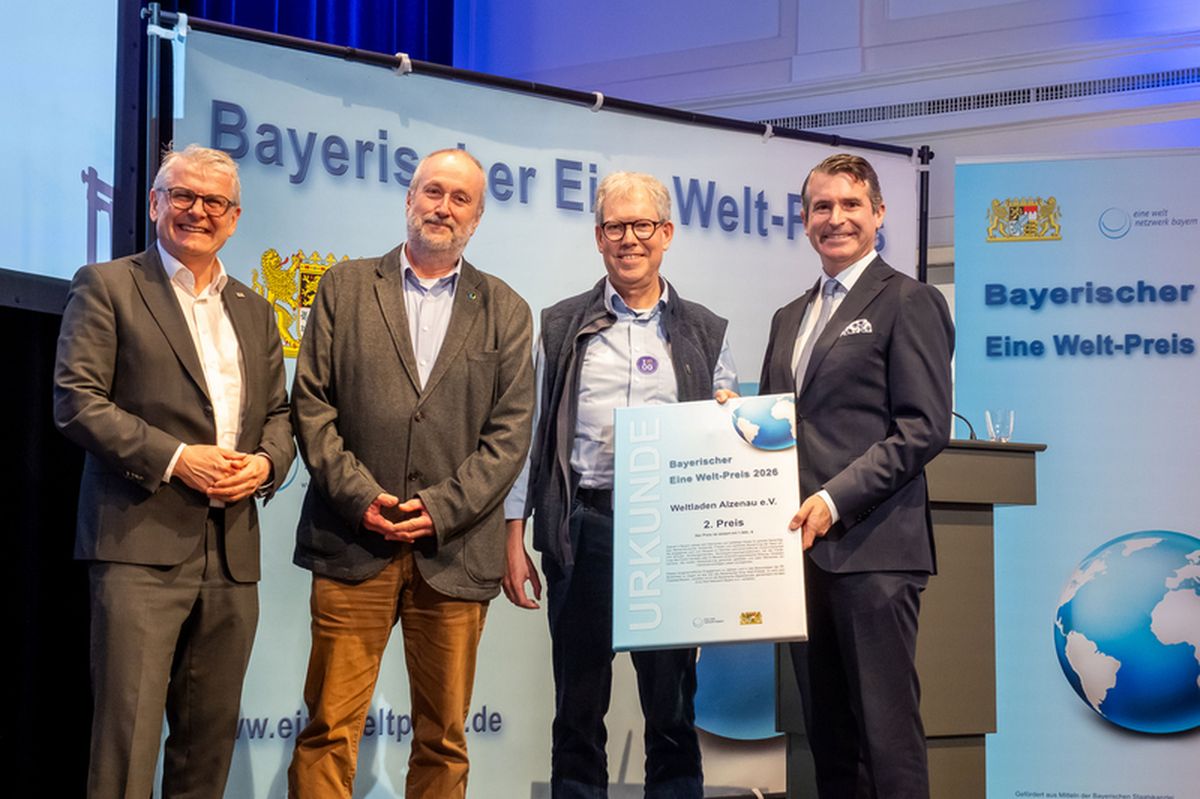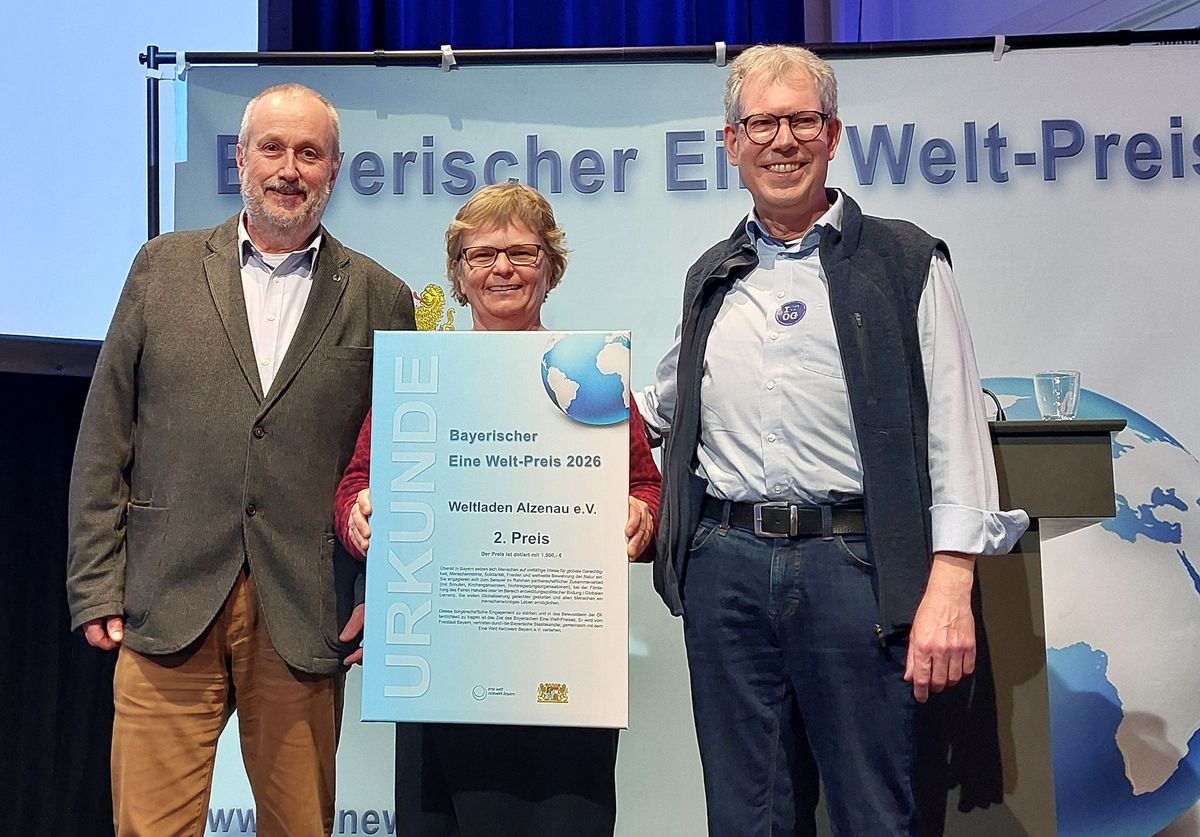 Alzenau/Kempten (POW) Große Freude beim Weltladen Alzenau: Beim Bayerischen Eine-Welt-Preis 2026 hat der Verein am Samstag, 14. März, unter 63 Bewerbungen den zweiten Platz erreicht. Mit der Auszeichnung würdigen der Freistaat Bayern, vertreten durch die Bayerische Staatskanzlei, und das „Eine Welt Netzwerk Bayern“ alle zwei Jahre herausragendes bürgerschaftliches Engagement für eine gerechtere Welt, heißt es in einer Pressemitteilung des Weltladens Alzenau.