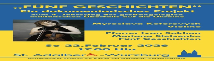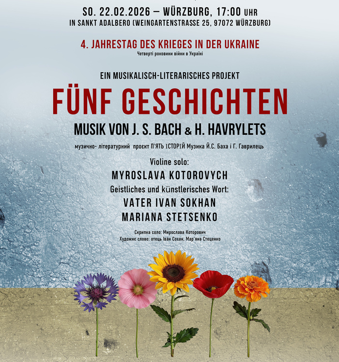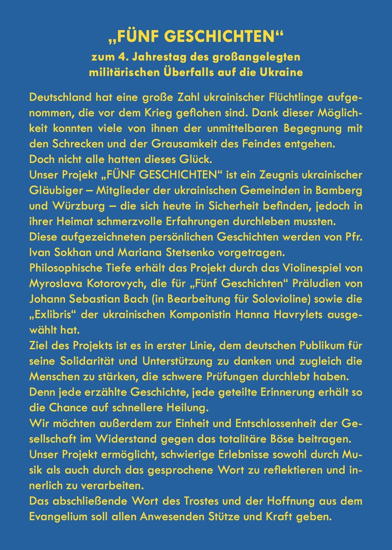 Diese aufgezeichneten persönlichen Geschichten werden von Pfr. Ivan Sokhan und Mariana Stetsenko vorgetragen. Philosophische Tiefe erhält das Projekt durch das Violinespiel von Myroslava Kotorovych, die für „Fünf Geschichten“ Präludien von Johann Sebastian Bach (in Bearbeitung für Solovioline) sowie die „Exlibris“ der ukrainischen Komponistin Hanna Havrylets ausgewählt hat.