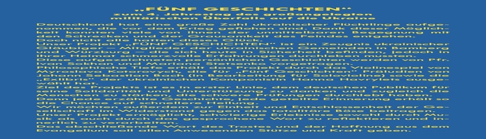 Unser Projekt „FÜNF GESCHICHTEN“ ist ein Zeugnis ukrainischer Gläubiger – Mitglieder der ukrainischen Gemeinden in Bamberg und Würzburg – die sich heute in Sicherheit befinden, jedoch in ihrer Heimat schmerzvolle Erfahrungen durchleben mussten.